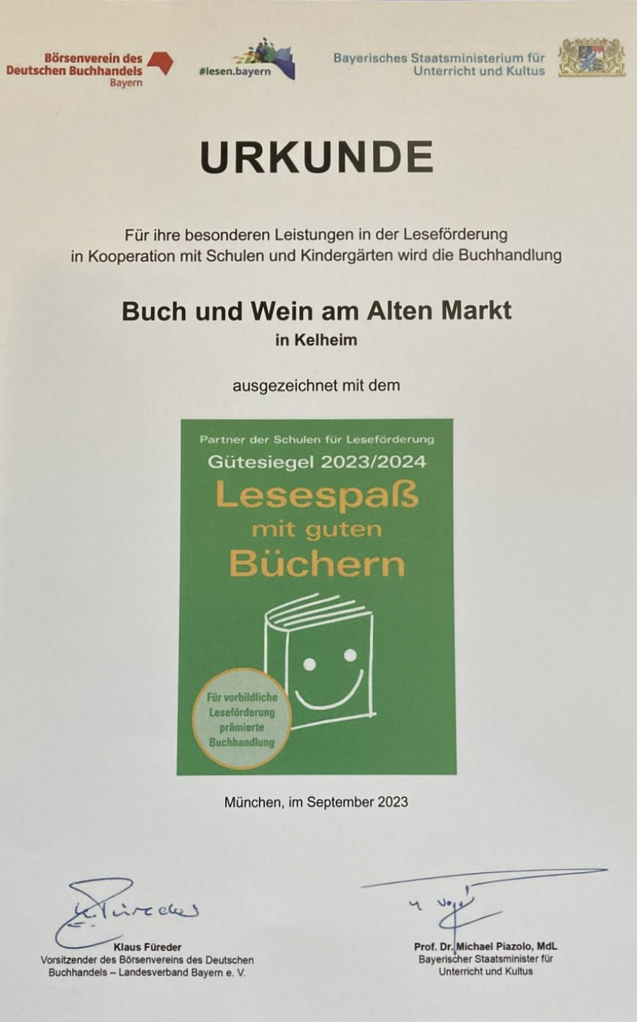 Wir haben auch 2023 wieder das Gütesiegel für vorbildliche Leseförderung vom Börsenverein des Deutschen Buchhandels erhalten.